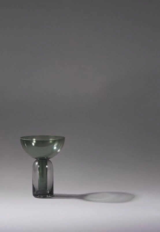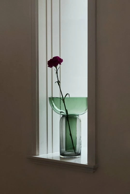 AYTM:n Torus-maljakkoa hallitsee geometristen muotojen hallittu harmonia. Lasimaljakko koostuu näyttävästi värjätystä suppilonmuotoisesa yläosasta ja sitä kannattelevasta tummasävyisestä alaosasta. Suppilon kapea varsiosa tarjoaa hyvän tuen kasvien varsille, kun taas ylöspäin avautuva päällinen reunustaa kauniilla tavalla niin runsaita kimppuja kuin yksinkertaisia oksia. Torus on ilmava, kerroksellinen ja ainutlaatuinen taideteos, joka kääntää katseet myös maljakon ollessa tyhjä.